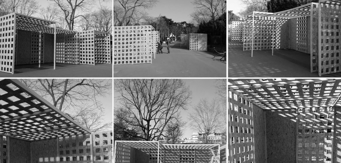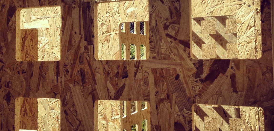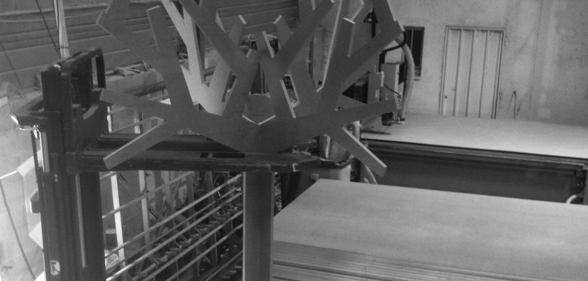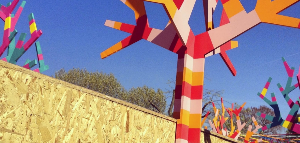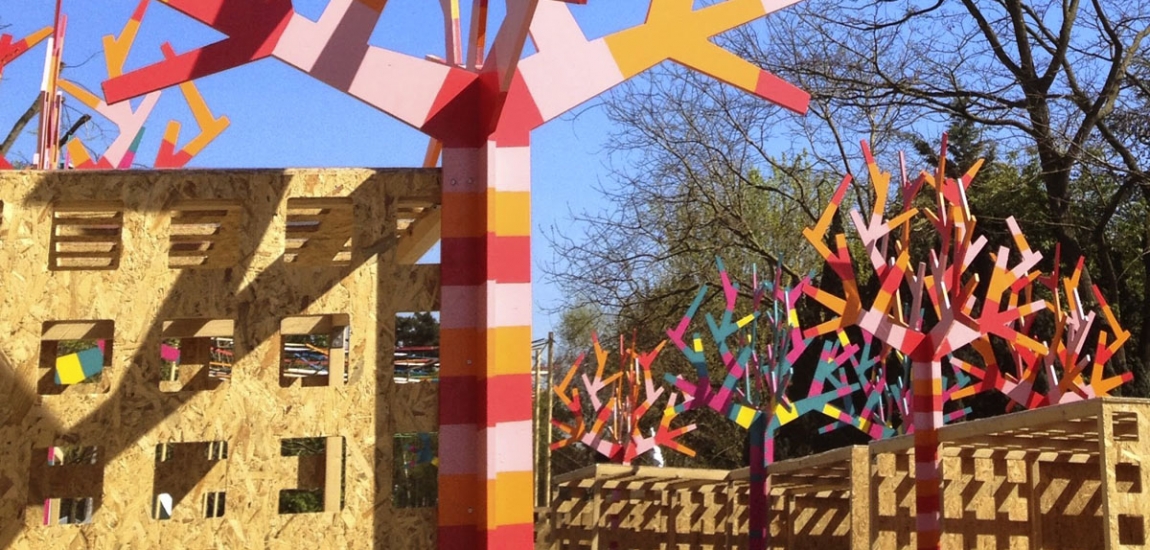 Création d’un tunnel sensoriel. Construction des cabanes, découpe numérique, assemblage, peinture. Fabrication des arbres, découpe en atelier.