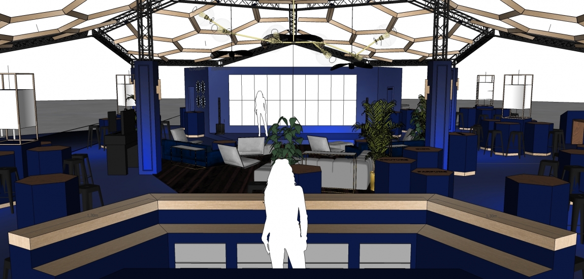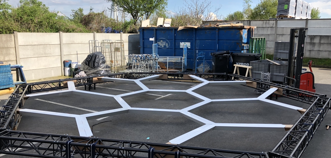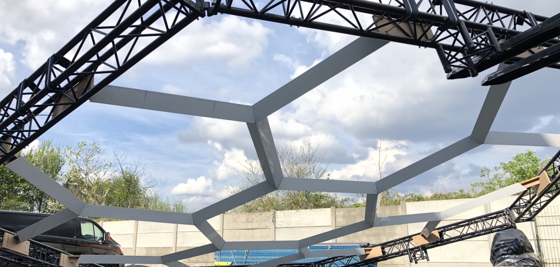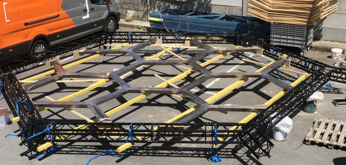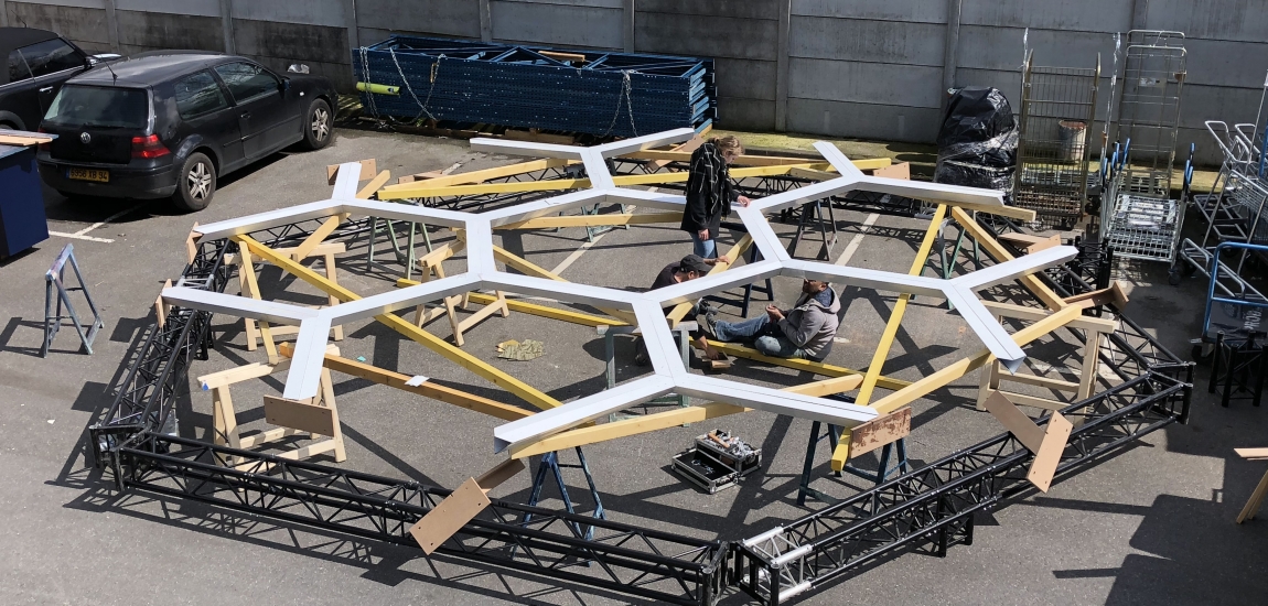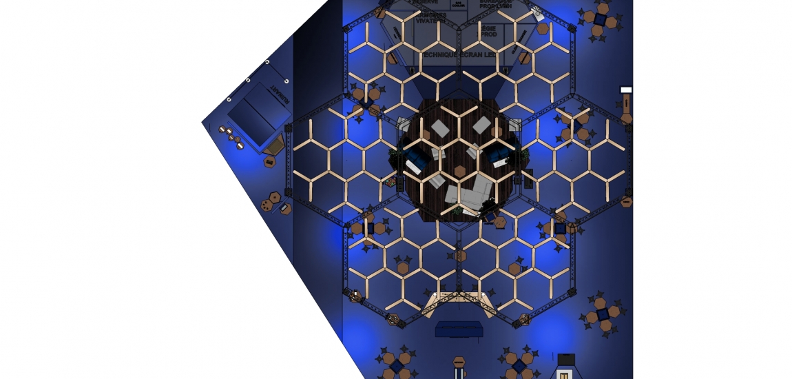 Etude, conception de la structure du stand en dome composé de 7 hexagones.